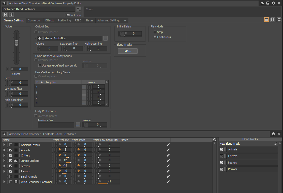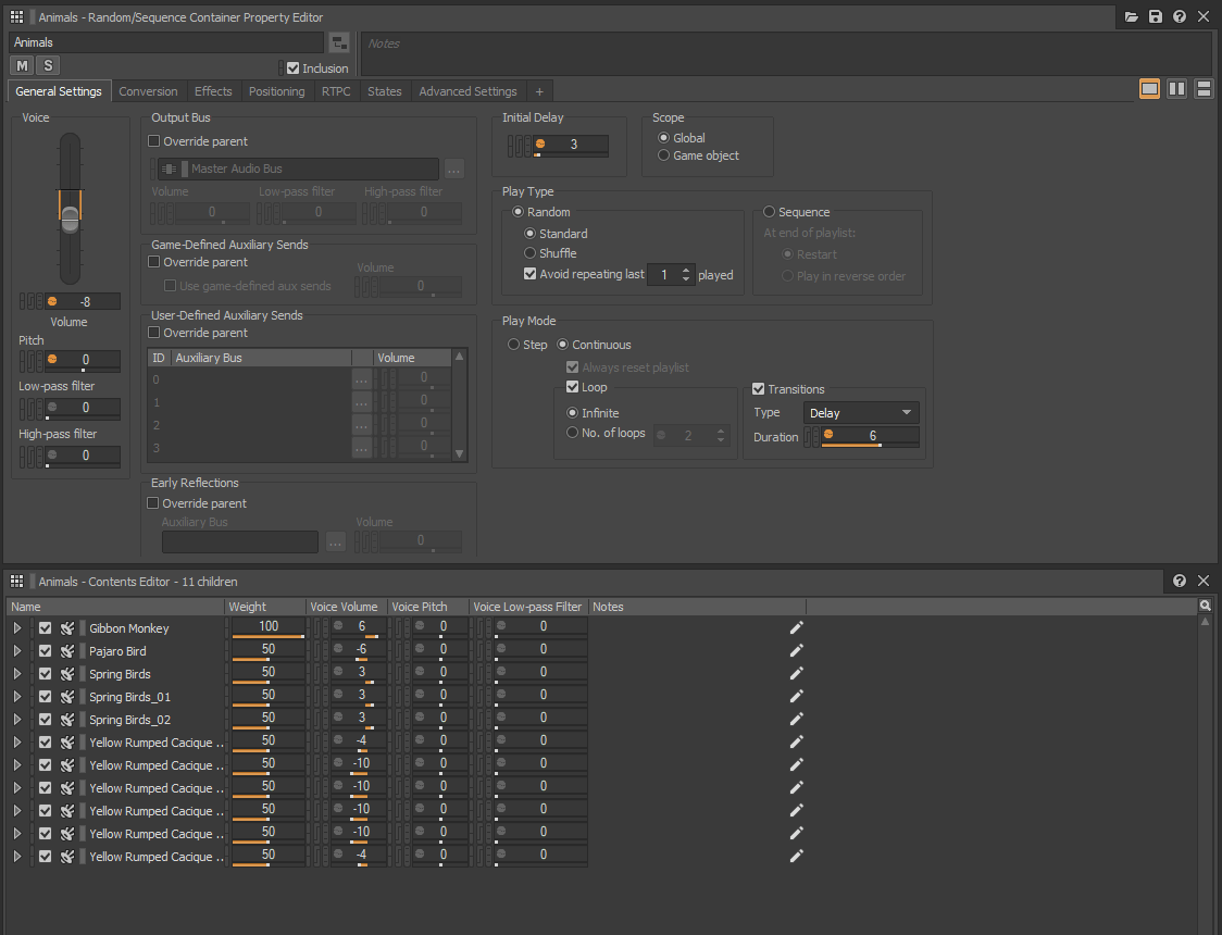 Each random container is set to randomly play during gameplay, with a relatively high delay between events to ensure that the listener isn’t overwhelmed with animal noises. They’re also manipulated to play at various levels of volume, pitch, panning, and positioning within the game, and will hold their 3D position for the entirety of the event. So for example if the character moves the camera to look toward the source of the sound, that sound will pan accordingly to create a sense of realism, even though there isn’t actually any animals in the game itself. All of these random containers are combined with the base ambient track and blended together, to create a dynamic environment that sounds alive and full of animals and insects.