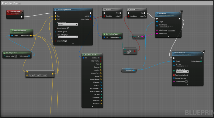 After much trial and error, I managed to accomplish this by using what is called a line trace, drawing it from the character down to the ground, and sending a command to Wwise with the surface type that the character was standing on. These surface types, called Physical Materials in UE4, were manually set up, and attached to each object. The footstep event was then attached to the character’s run animation, and as a result, every time the event was triggered, UE4 would determine the surface type the character was standing on, send that information to Wwise, and Wwise would play a sound from the corresponding random container associated with that surface type.