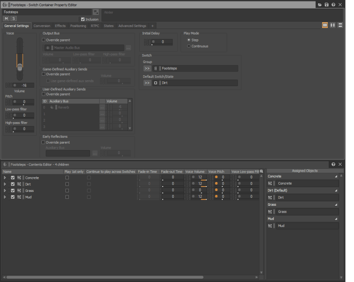Starting off with the footstep audio event, which was probably the hardest thing for me to get working properly, as well as took the most amount of time. For this project I wanted the sound of the character’s footsteps to change based on what type of surface the character was walking on. This was set up in Wwise using a variety of Random Containers for each surface type with the corresponding audio files within each one. This was then controlled via a Wwise “Switch” for each surface type (Dirt, Mud, etc) which determined which container would be played when the event was triggered. However the difficulty for me was getting the game to properly communicate which switch to trigger.